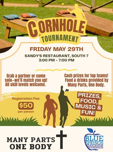 On Friday May 29th we will host our very first cornhole tournament to help raise money for the Blue Springs Education Foundation’s “Kids R.O.C.K.” fund! The tournament will begin at 3:00 pm and will take place in the parking lot at Sandy’s Restaurant on South 7-Highway in Blue Springs. We’ll be selling BBQ the day of the event, and teams can register online in the near future.